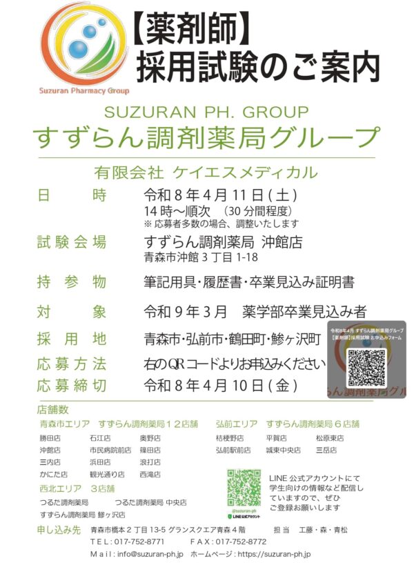 【薬剤師】令和8年度│採用試験のご案内 2026.04.02 本部 お知らせ 採用情報 薬学部6年生(令和9年3月卒業予定)の方へ、新卒者採用試験のご案内です。 令和8年4月11日(土)すずらん調剤薬局沖館店におきまして、採用試験を行います。 あなたのやる気を、すずらん調剤薬局グループで活かしてみませんか! 応募は下記のQRコードよりお願い致します。(タップでリンク先へ移動します) ぜひ、私たちと一緒に地域に貢献してみませんか! あなたのご応募、お待ちしております^^ 投稿ナビゲーション 前へ【調剤事務(青森市)】令和8年度│採用試験のご案内