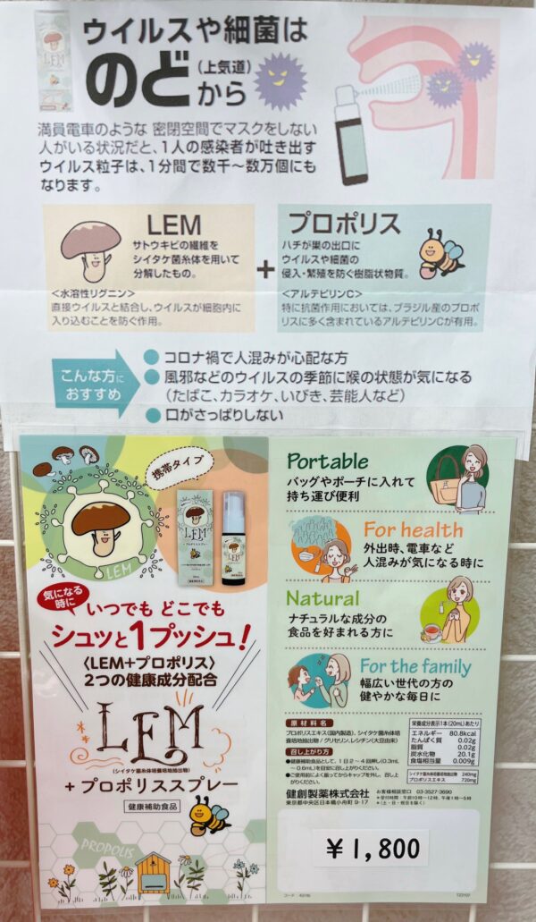 にLEM(直接ウイルスと結合し、ウイルスが細胞内に入り込むことを防ぐ作用)を加えたスプレータイプの健康補助食品です。