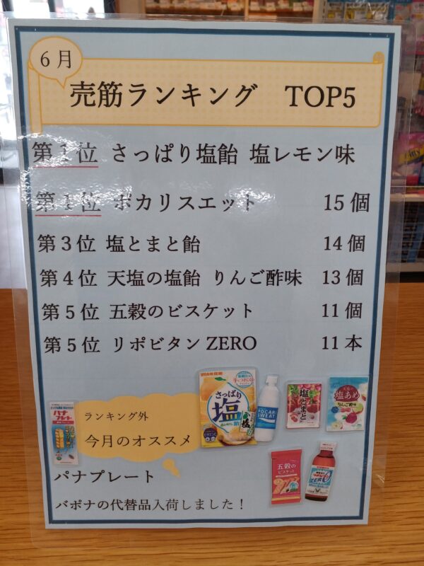 暑かったからでしょうか。1位は さっぱり塩飴 塩レモン味と ポカリスエットでした。